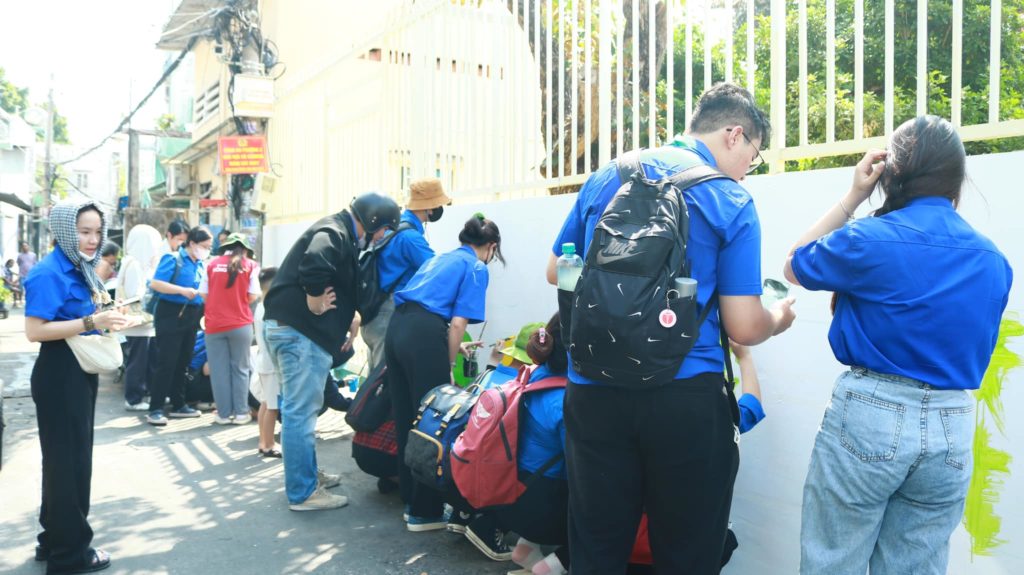 Hình ảnh sinh viên HIU – vẽ tranh tuyên truyền bảo vệ môi trường và tặng cây xanh cho người dân