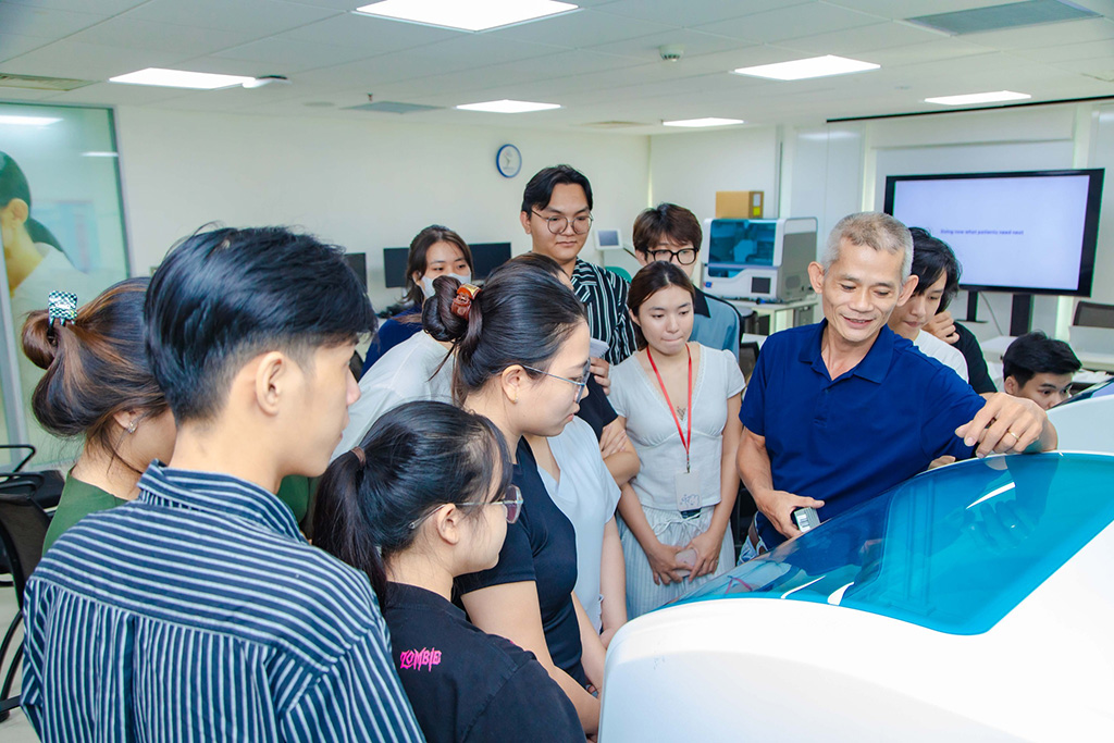 Dưới sự hướng dẫn của ông Phạm Trọng Tiến – Giám đốc Trung tâm Huấn luyện Chẩn đoán Kiểu mẫu Roche, sinh viên có cơ hội tiếp cận các công nghệ xét nghiệm sinh hóa – miễn dịch tiên tiến như kỹ thuật điện hóa phát quang, các dòng máy phân tích tự động và hệ thống xét nghiệm hoàn toàn tự động (Automation), những công nghệ đang được triển khai tại nhiều cơ sở y tế lớn tại TP.HCM và trên cả nước.