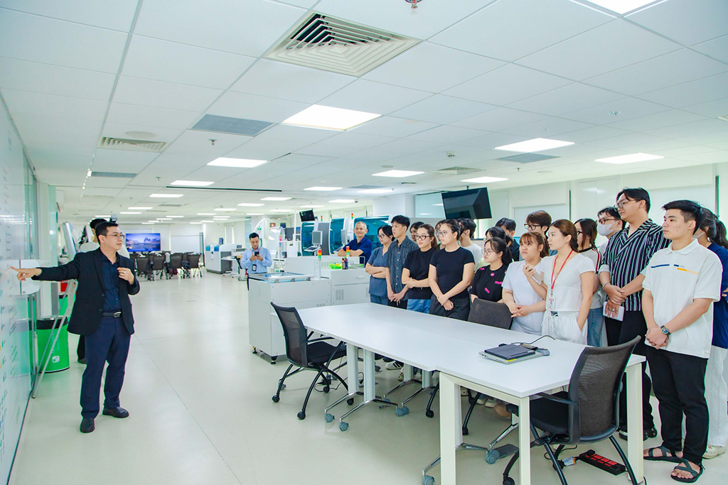 Chuyến kiến tập diễn ra từ ngày 15 đến 17/12/2025, dưới sự hướng dẫn của ThS. Vũ Hồng Hải – Phó Trưởng khoa Xét nghiệm Y học, cùng đội ngũ giảng viên của Khoa. Tại không gian phòng xét nghiệm hiện đại có quy mô hơn 400 m², sinh viên được trực tiếp quan sát và tìm hiểu toàn bộ chuỗi hoạt động của một phòng xét nghiệm đạt chuẩn quốc tế, từ xét nghiệm nhanh tại chỗ, sinh học phân tử, huyết thanh học kết nối hệ thống tiền phân tích tự động, đến các giải pháp công nghệ thông tin hỗ trợ quản lý và vận hành.