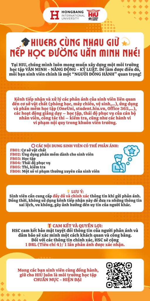 🌸 Nhằm nâng cao chất lượng phục vụ và xây dựng môi trường học tập văn minh – năng động – kỷ luật, Trung tâm Trải nghiệm & Việc làm Sinh viên (HSC) chính thức triển khai Kênh tiếp nhận phản ánh dành cho sinh viên HIU.