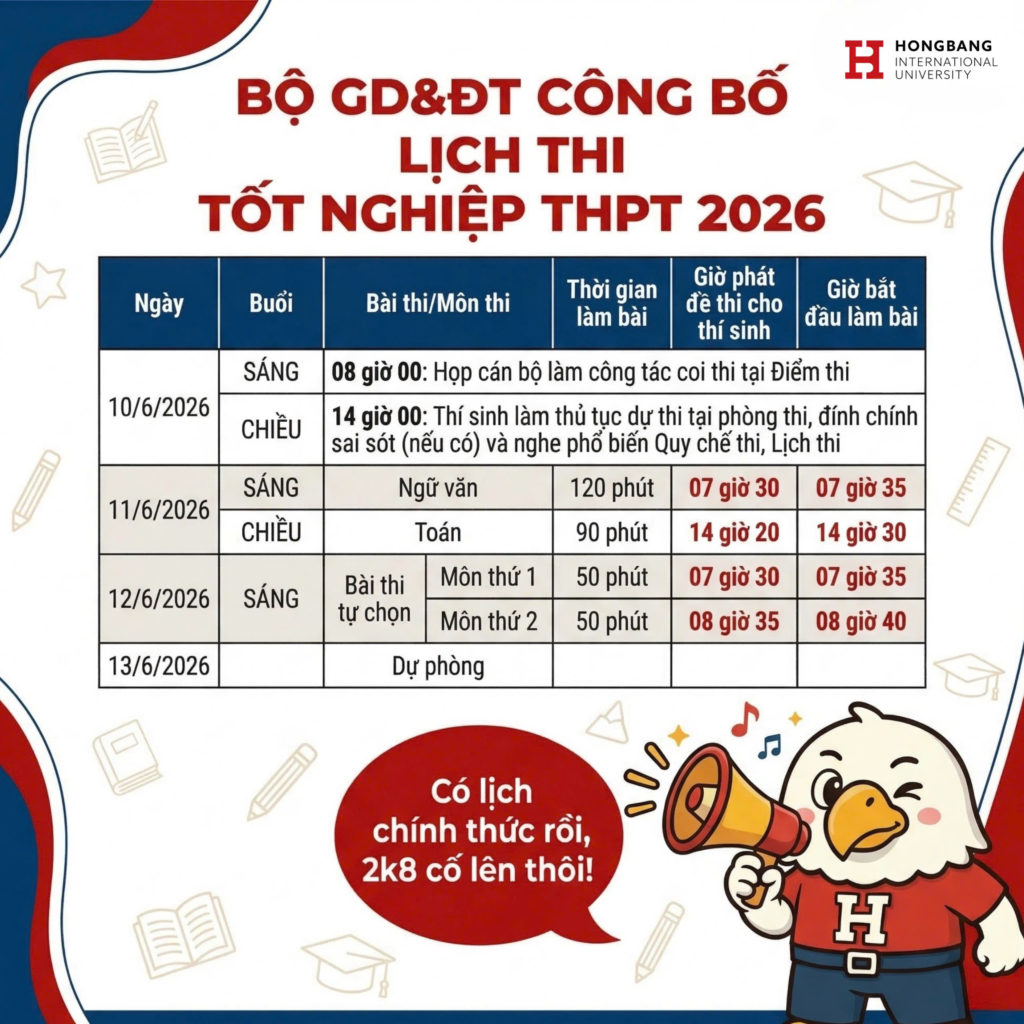 Theo thông tin Bộ GD&ĐT công bố, kỳ thi tốt nghiệp THPT năm 2026 sẽ diễn ra trong 2 ngày 11 và 12-6-2026. Đây là lịch thi chính thức mà học sinh 2k8 cần ghi nhớ sớm để chủ động lên kế hoạch ôn tập và chuẩn bị hồ sơ.