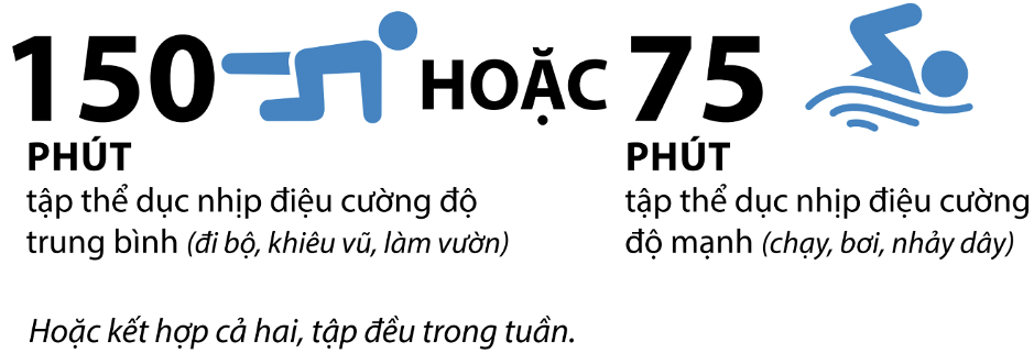 • Cường độ: Người trưởng thành cần ít nhất 150 phút tập thể dục nhịp điệu cường độ trung bình (đi bộ, làm vườn) hoặc 75 phút cường độ mạnh (chạy, bơi) mỗi tuần.