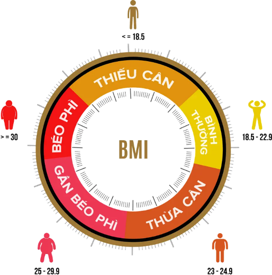 • Chỉ số BMI: Mục tiêu tối ưu là duy trì chỉ số khối cơ thể (BMI) dưới 25.